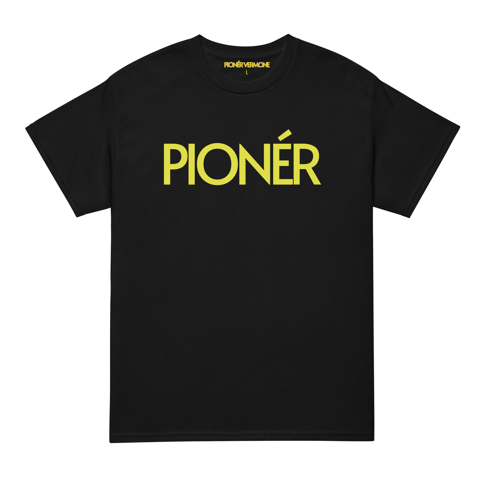 The Pionér core logo appears in bold, matte-like lettering on the signature tee.