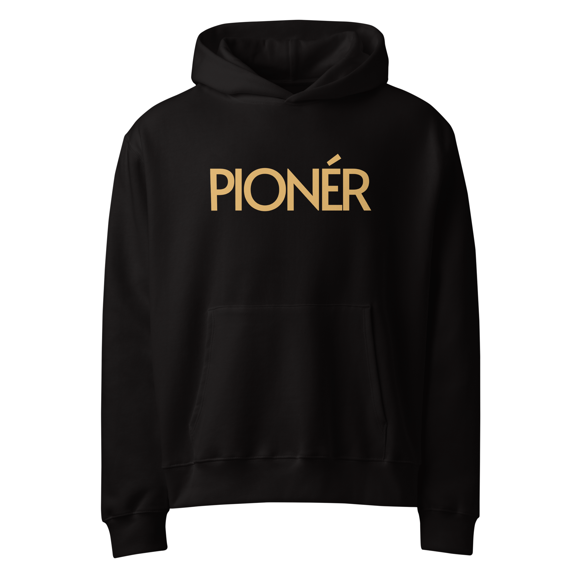 The Pionér classic logo design appears in bold, matte-like finish on the signature heavyweight hoodie.