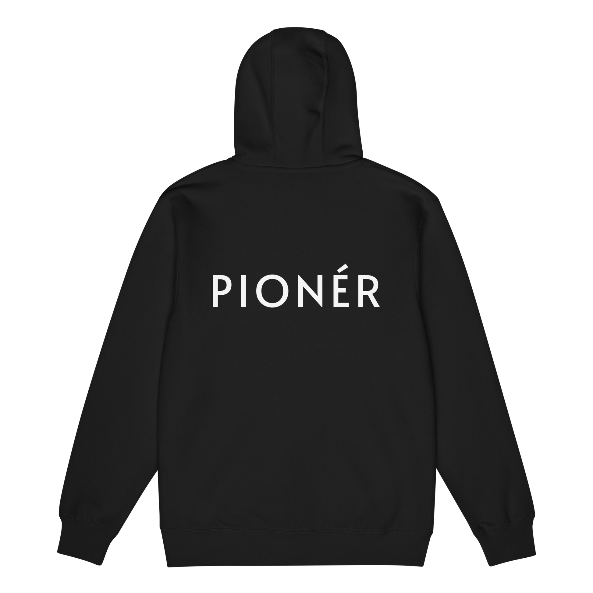 The Pionér classic logo design appears in bold, matte-like finish on the signature heavyweight zip hoodie.